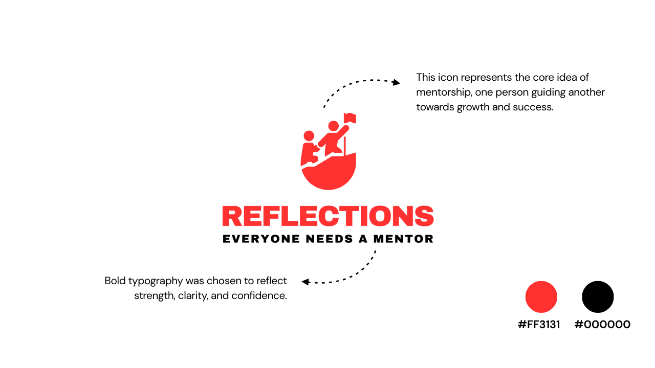 Reflections is a mentorship platform focused on growth and guidance. The client wanted a clean yet meaningful logo, so I created an icon showing a mentor helping another person climb symbolizing support and progress.